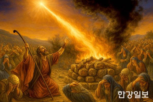 하나님은 3년 반이 지난 때가 되자 엘리야에게 산에서 내려가 아합 왕을 만나라고 하셨다. 아합 왕도 어떻게든 자기 민족에게 닥친 가뭄을 해결하려고 물길을 찾아 헤매다가 엘리야를 만났다. 왕과 엘리야는 만나자마자 서로 가뭄은 네 탓이라며 싸우다가, 결국 갈멜산에서 하나님과 우상신 중 누가 참 신인지 따져보자고 한다. 이것이 그 유명한 ‘갈멜산의 대결’이다.