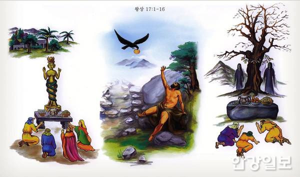 아합 왕에게 가뭄을 선포한 엘리야는 그릿 시냇가에 숨어 기도하며 지냈다. 그러나 그곳에는 먹을 것이 전혀 없었다. 그는 하나님이 보내주신다는 까마귀를 기다리고 있었는데, 그때 갑자기 사람의 목소리가 들려왔다. 숨어서 지켜보니, 바알과 아세라 신을 섬기는 사람들이 비를 내려달라고 간절히 기도하며 정성껏 만든 음식을 가져와 제사를 드리고 있었다.